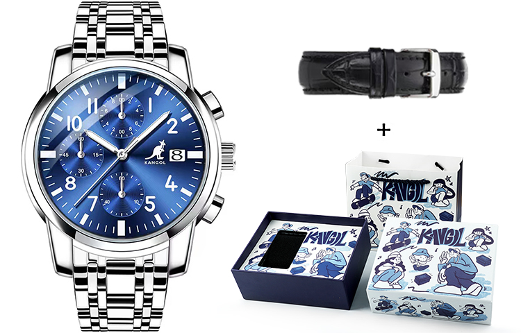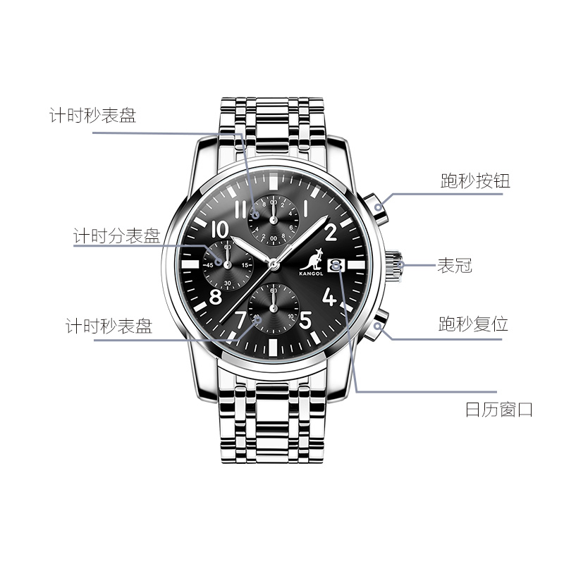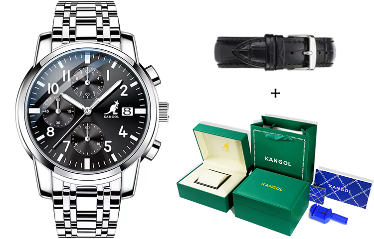 KANGOL Three Eye Six Hand Multifunction Quartz Movement Stainless Steel Watchband Watch Men"s Watches