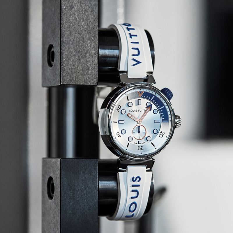 LOUIS VUITTON TAMBOUR Wrist Watch Quartz Movement Rubber Strap 39.5mm White Dial Unisex 100m Water Resistant QBB175