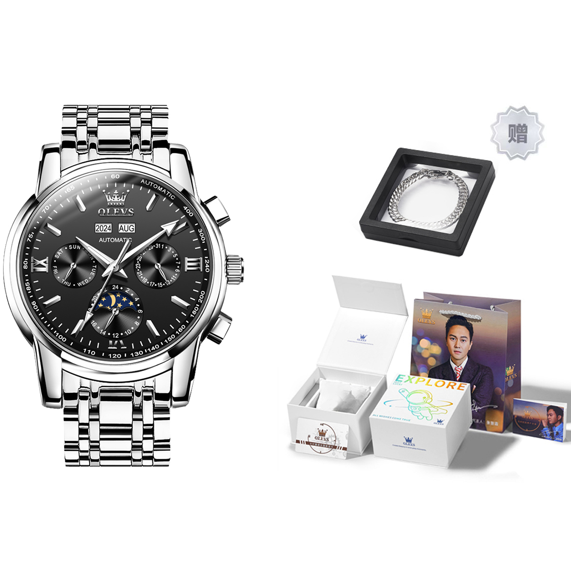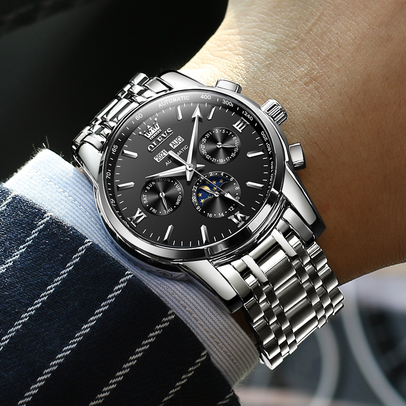 OLEVS Mechanical Movement Stainless Steel Watchband Watch Men"s Watches Black Dial